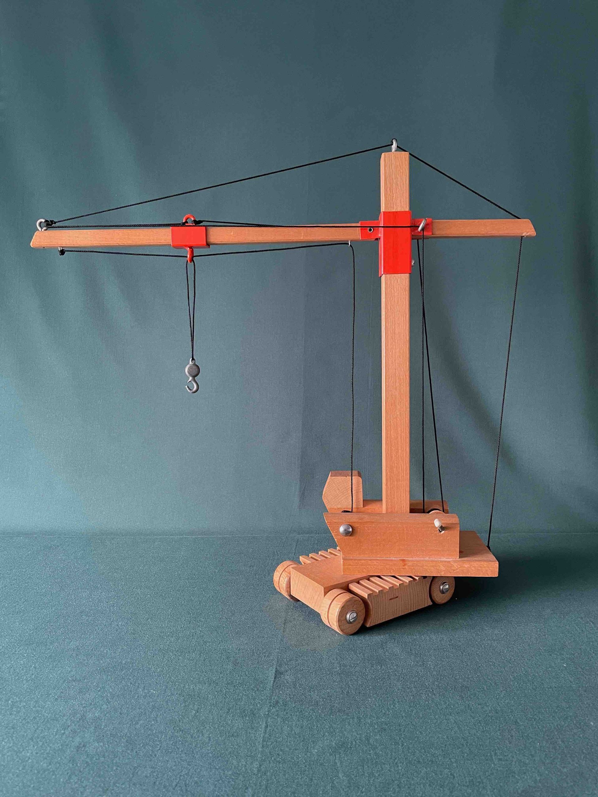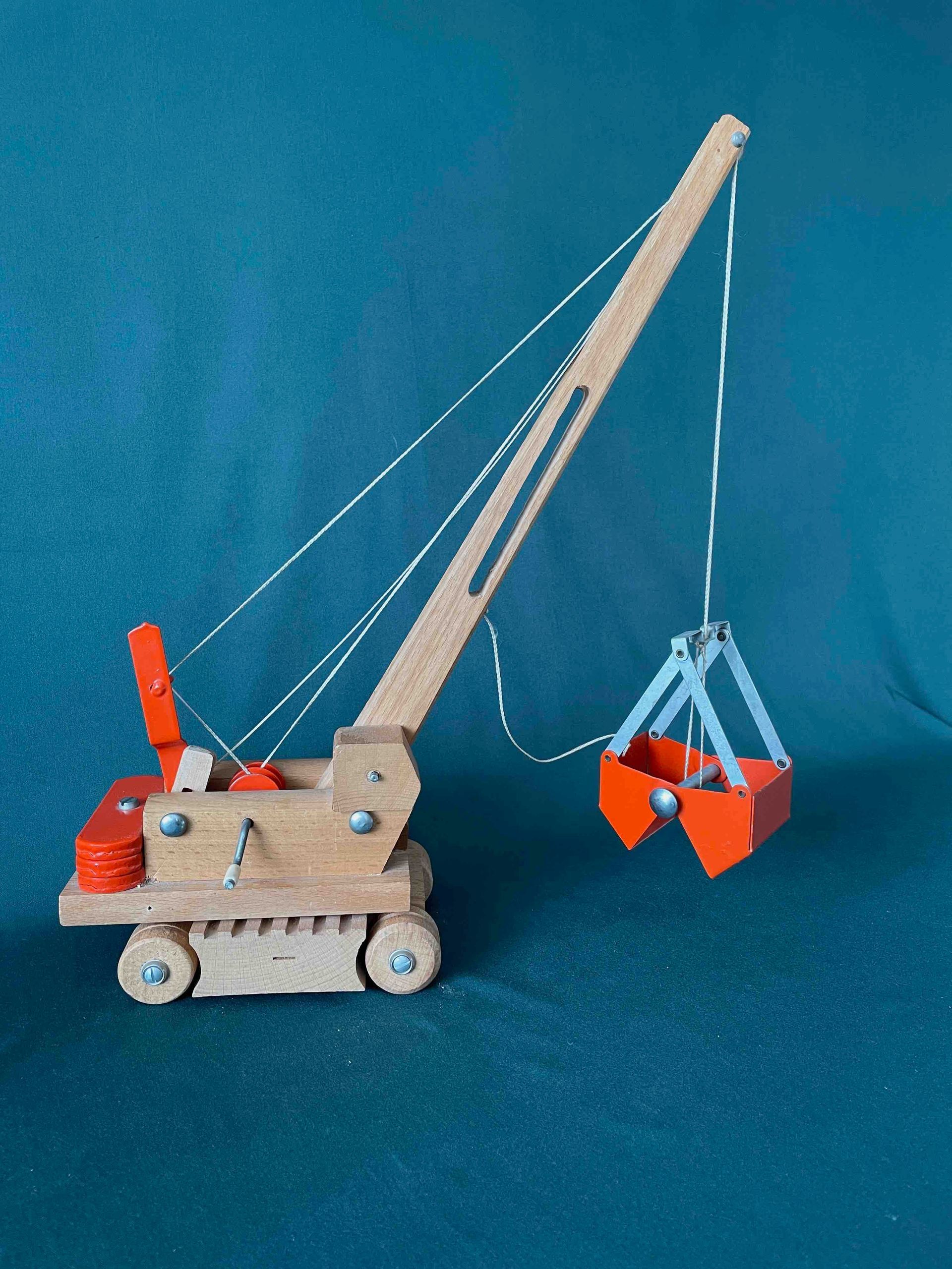 Op het basismodel draait een platform met een cabine, een giek met twee lieren. Met de ene lier wordt de giek op- en afgetopt. De andere lier heeft twee gekop-pelde liertrommels. Samen zorgen deze twee trommels voor het hijsen en vieren van de grijper. Op het platform is een oranje hendel geplaatst. Door deze hendel naar achter te bewegen, wordt één hijskabel langer. Daardoor sluit de grijper en gaat omhoog. Door de hendel naar voren te bewegen wordt de hijskabel korter en gaat de grijper dicht. Een unieke oplossing voor deze gecompliceerde kraanbeweging (die in werkelijkheid niet is toegestaan).