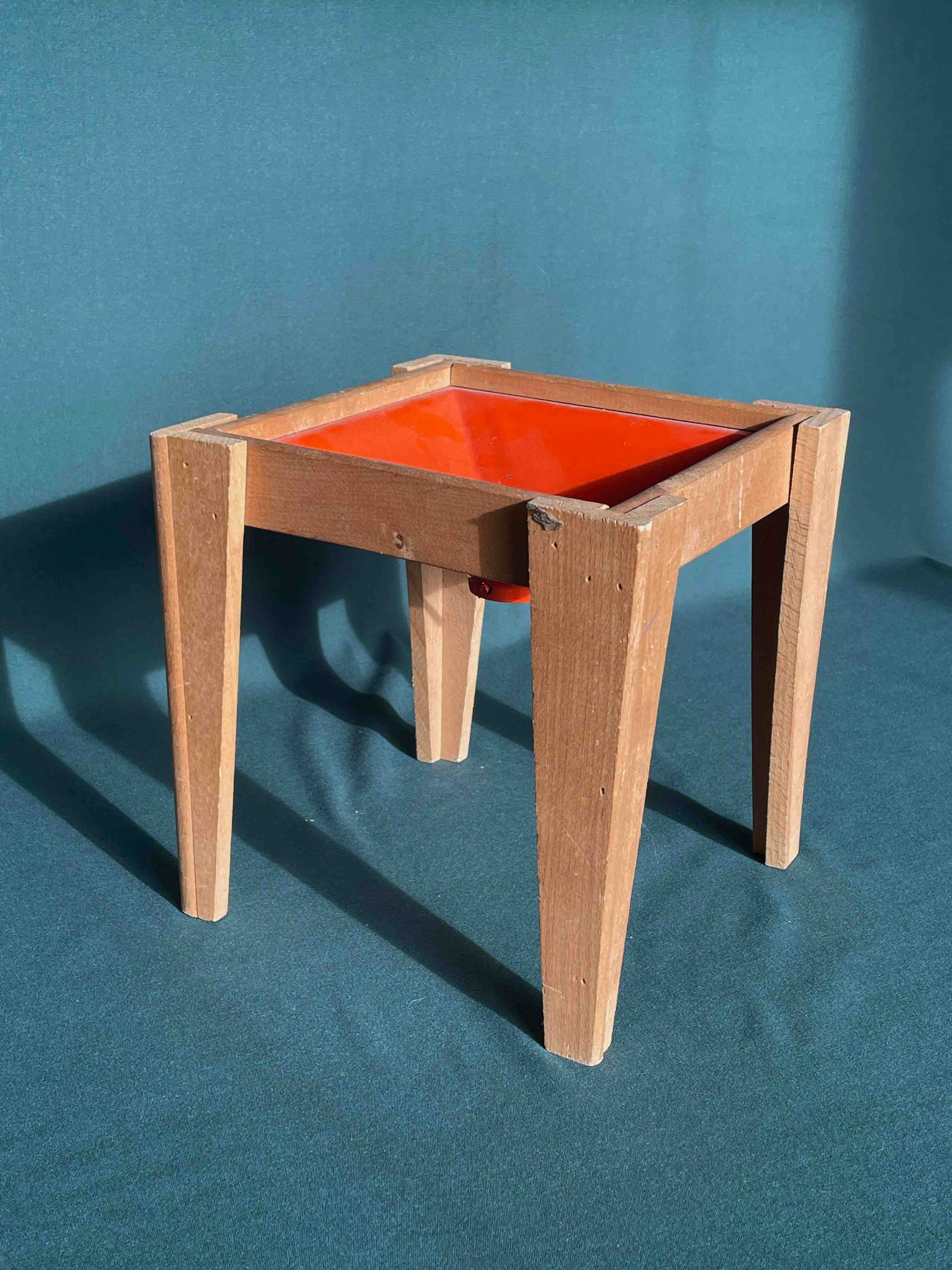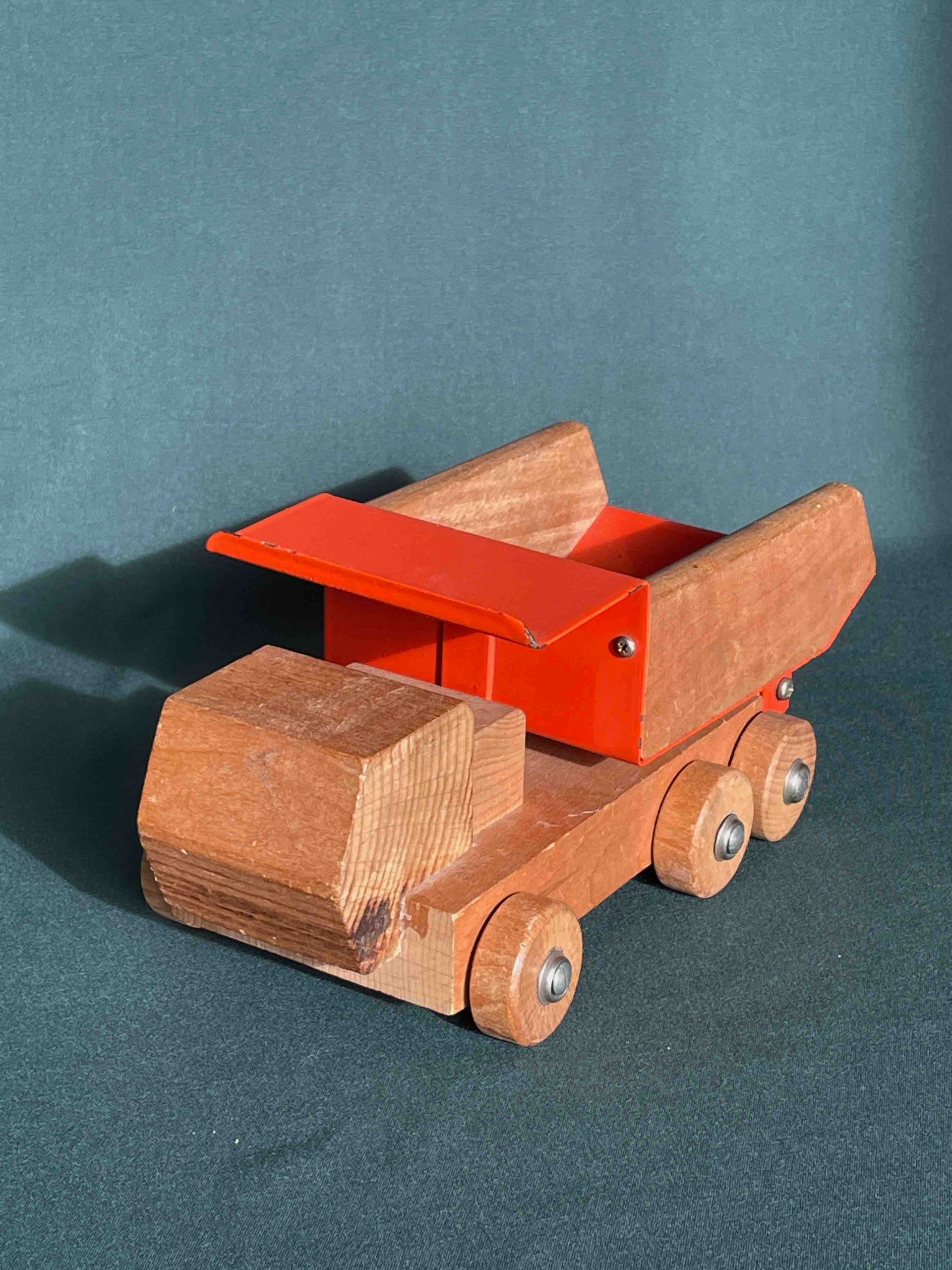 Op dit platform staat de cabine en bevindt zich het scharnier van de laadbak. De laadbak zelf is een handige combinatie van oranje epoxy op staal én beuken-hout. De laadbak loopt door tot boven de cabine. Dat geeft een frai lijnenspel.